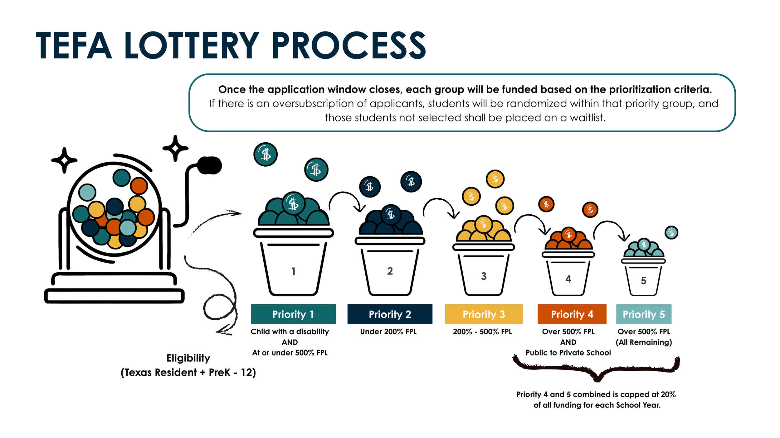 For purposes of prioritization, the term “children with a disability” includes both children with an IEP on file with the Texas Education Agency at the time the application process closes and children who have submitted a program-approved proof-of-disability form with their application. However, only those children with an IEP on file who are accepted into the program are eligible for the increased funding amount available to children with a disability.